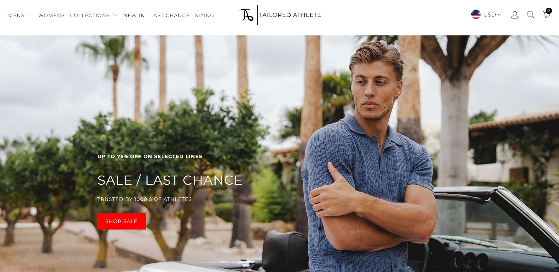 Let’s check out how Tailored Athlete, a brand specializing in athletic fit menswear, utilizes this tactic. Their header often features messages like “Up to 75% off on Selected Lines” or “Sale / Last Chance”.