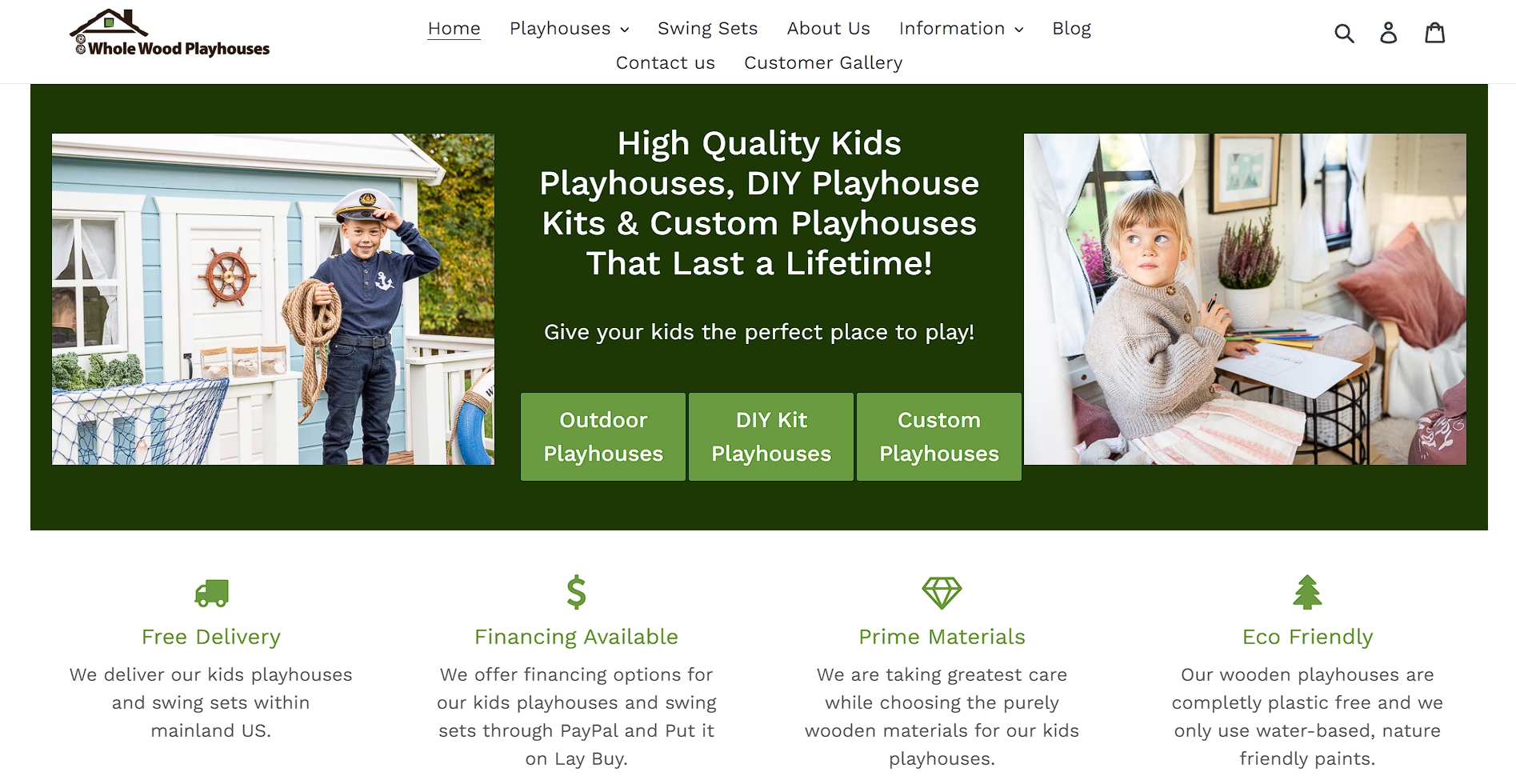 WholeWoodPlayhouses, a company selling ready-to-assemble outdoor playhouses for kids, communicates key benefits in their header.