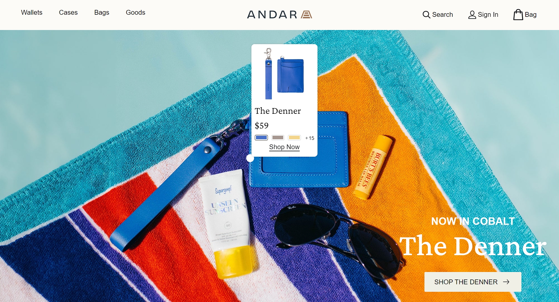 Andar, a brand specializing in leather wallets, bags, and cases, features a stunning hero image of their product in a natural setting.