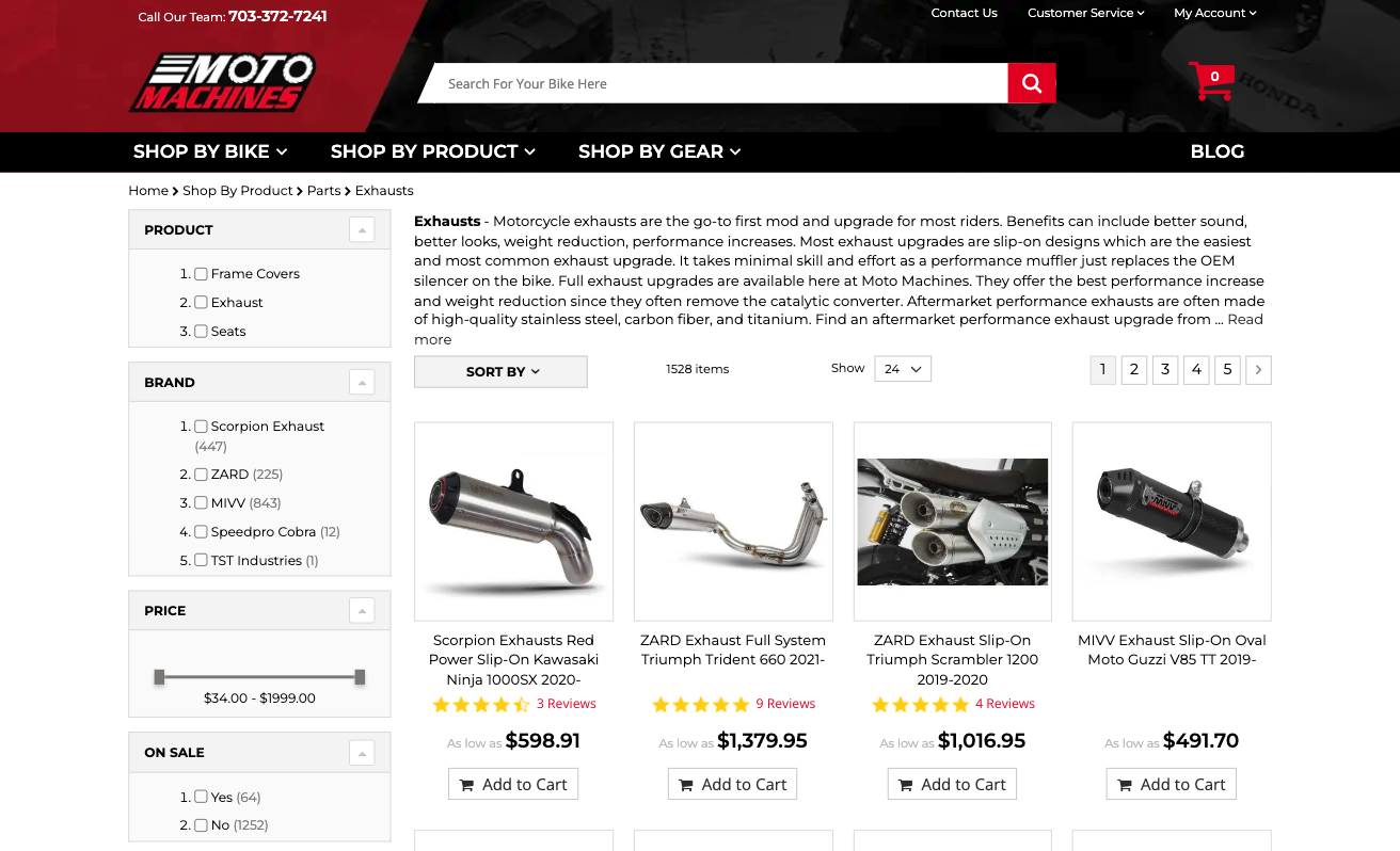Alternatively, for ecommerce brands, showing off product ratings on collection pages — as seen on the Moto Machines motorcycle exhausts page — offers similar benefits while allowing for a more conversion-oriented approach that effectively drives sales.