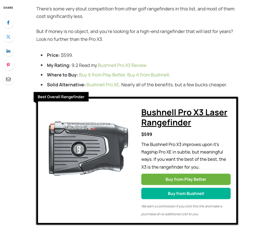 By investing in product (or price) comparison resources — like the Best Golf Rangefinders post on Breaking Eighty — you can effectively help your audience find the best product for their needs without ever having to leave your site. If you go a step further and enrich these articles with in-depth info, product links, visuals, and video, you’re guaranteed to see a boost in conversions and a significant lift in your brand’s reputation as a trustworthy source of purchase information for consumers.