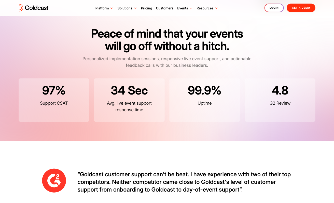 For instance, Saas brands regularly show off customer testimonials, certificates, and awards on their home pages, knowing how important these are to their audience. If you check out Goldcast, you’ll notice it includes multiple examples of positive feedback about the company’s products and customer service.