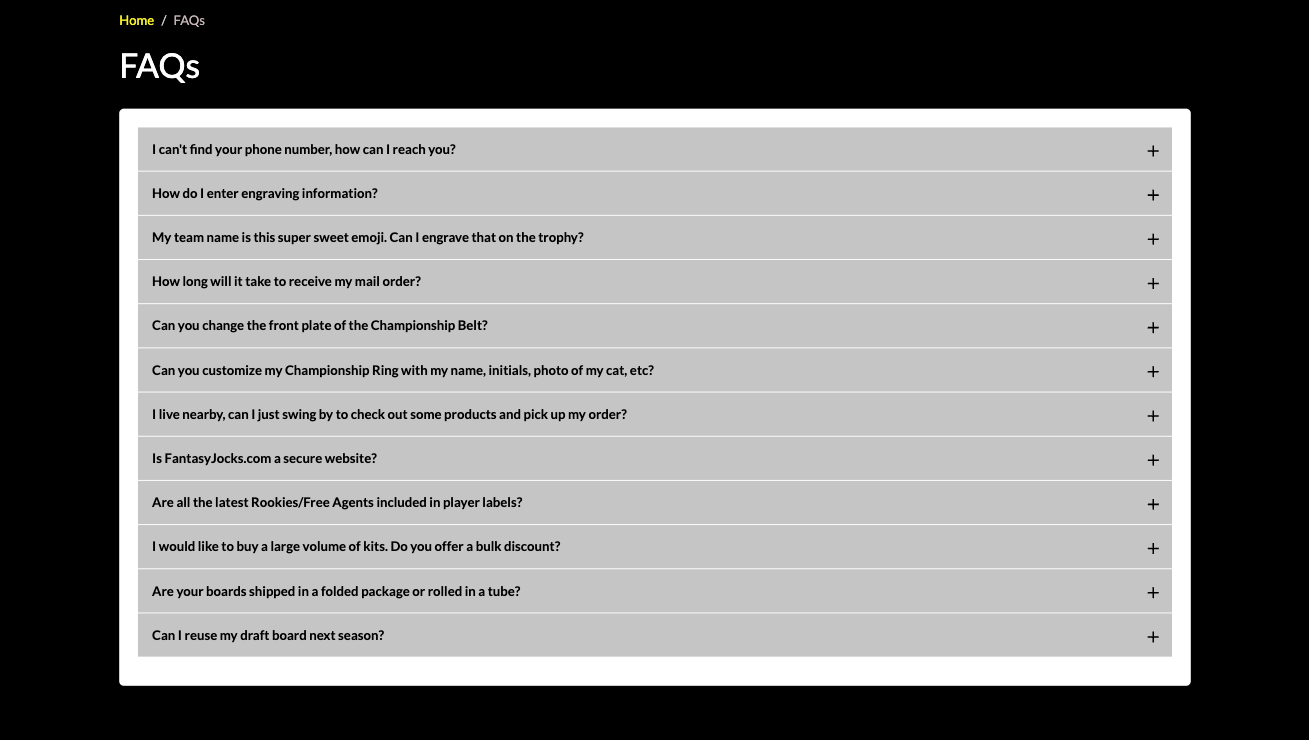 For instance, knowing that 59% of consumers prefer self-service for simple questions, your website should include an extensive selection of customer-support resources. These can include size charts, instruction manuals, and even a FAQ page like the one on Fantasy Jocks shown below.
