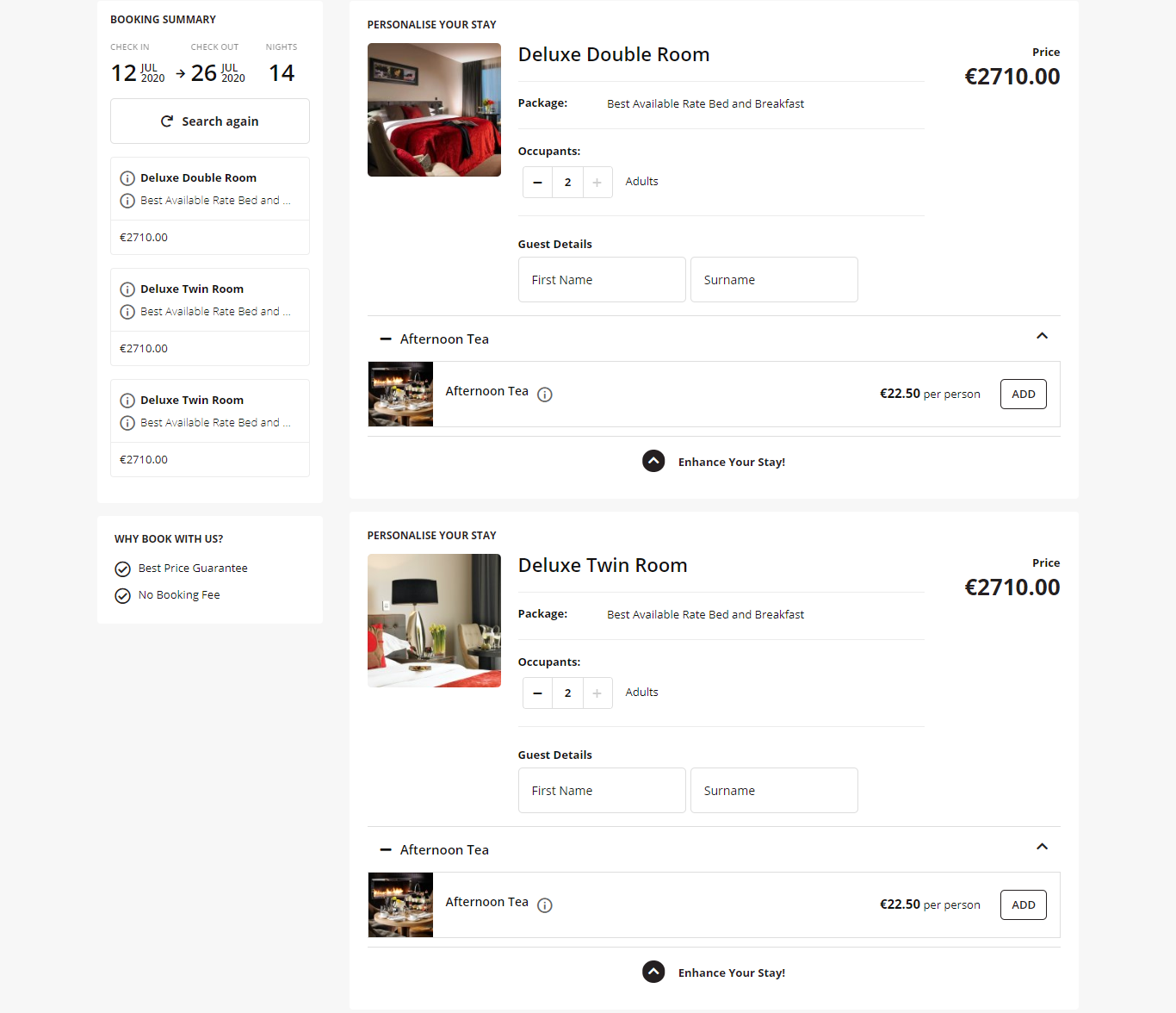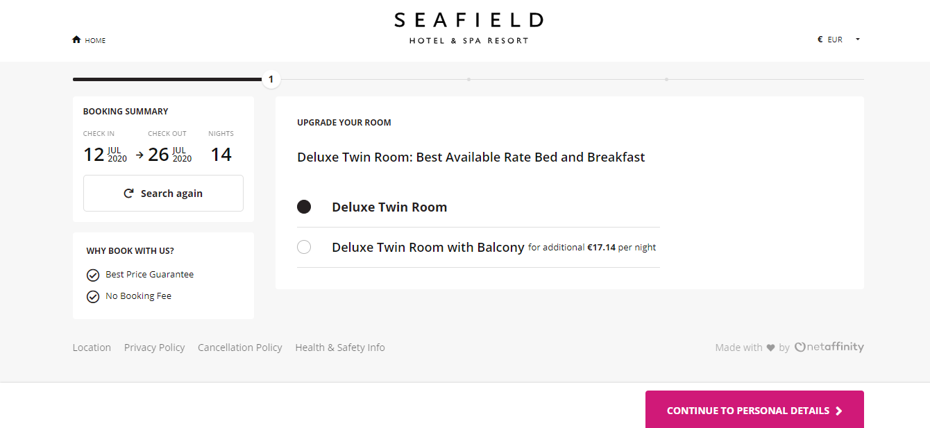 The Seafield hotel and Netaffinity propose to include the add-ons straight from the selection page. When you continue the booking, some pop-ups appear to suggest an upgrade on the selected room like balcony or afternoon tea.