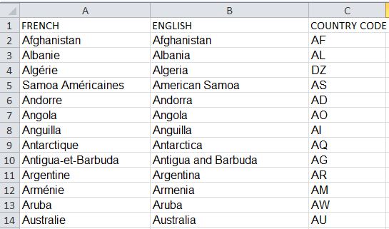 Countries list has been provided to developer to insert into the database. 248 countries have been inserted. Therefore, we have the countries list in french. Here is the excel file: Countries_List_French_cultbooking