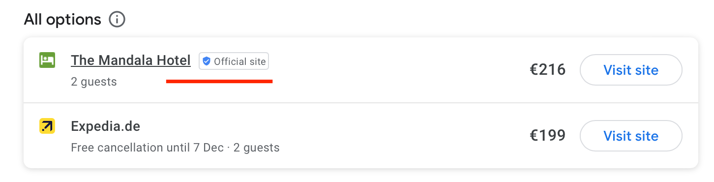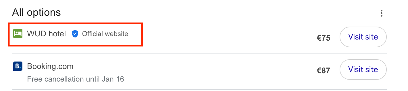 - Google adds an “Official Website” badge next to your hotel’s direct booking link. This badge helps users identify your own website as the trusted and authentic source to book directly with your hotel.