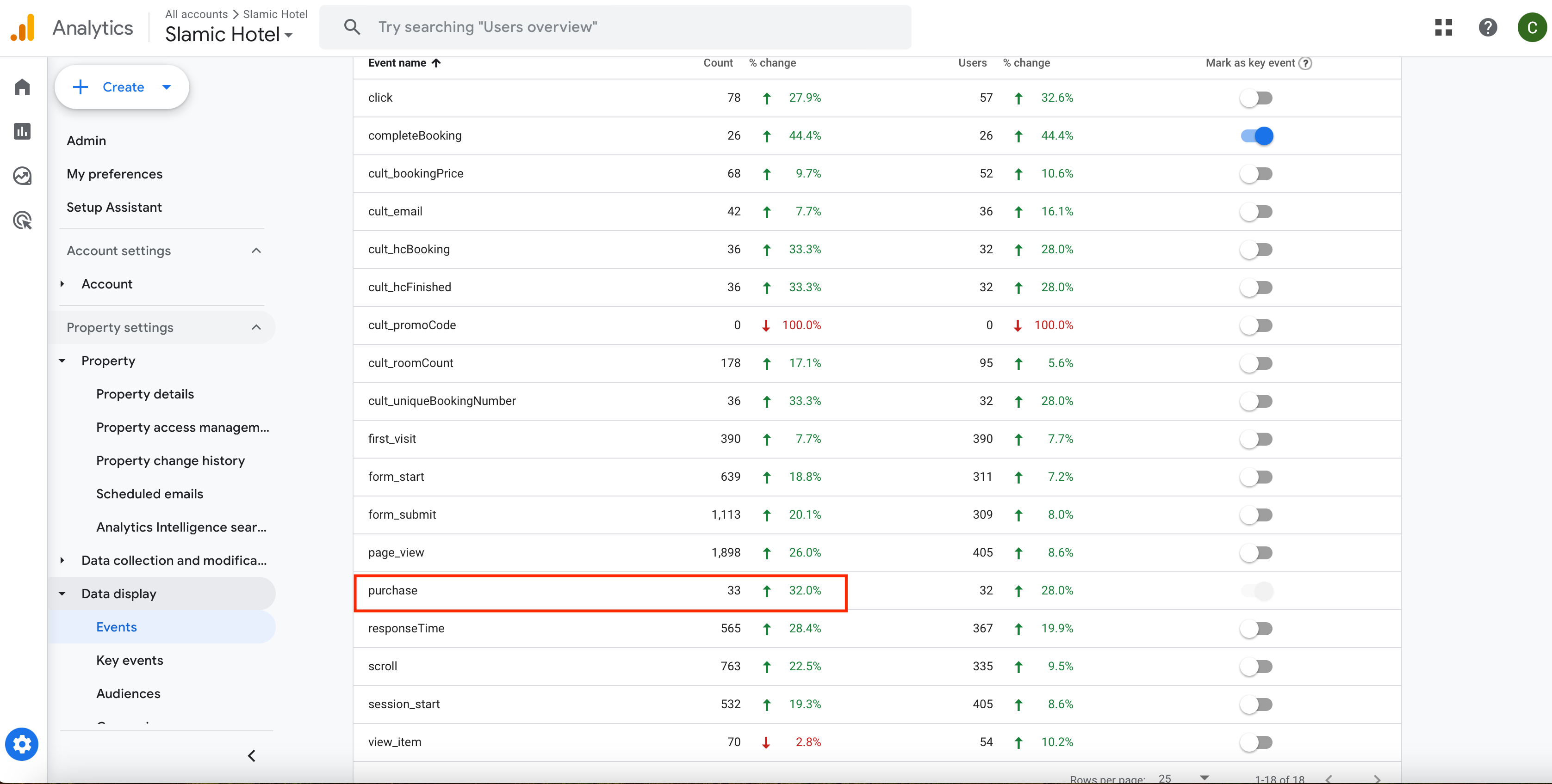 Data display > Events: shows 33 bookings and +32% change. (maybe when compared with previous period)