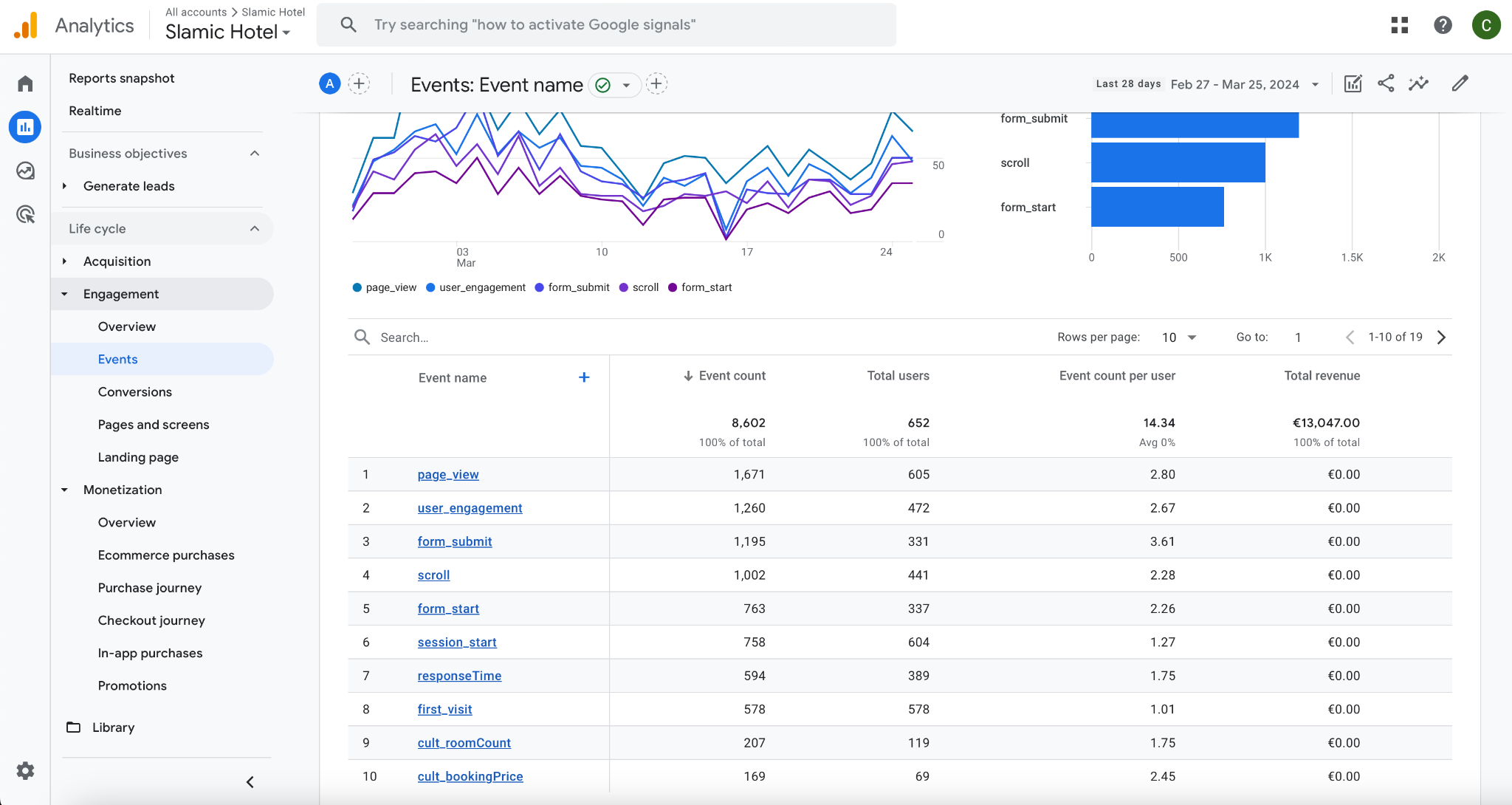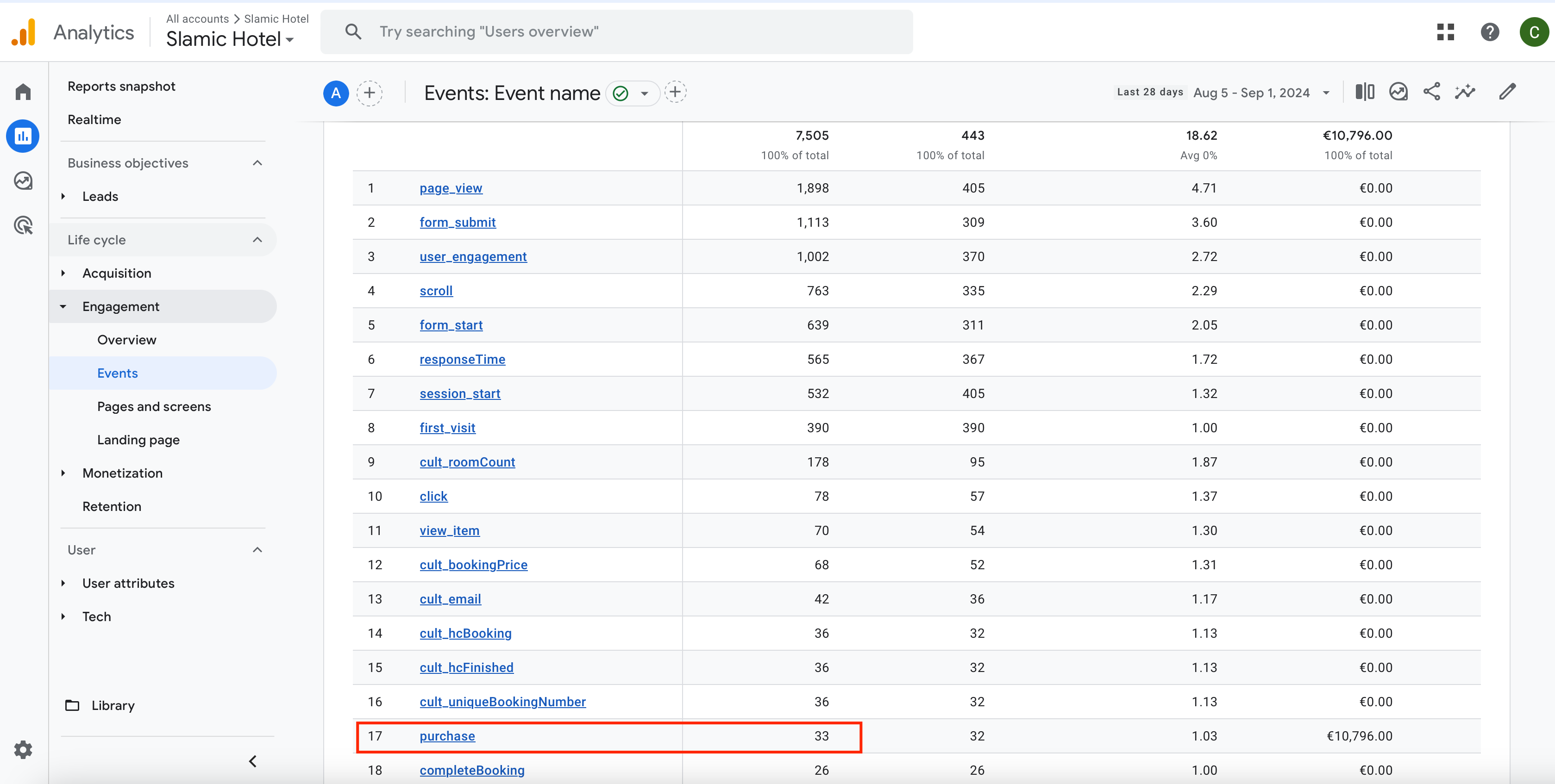 Engagement > Events, hows also 33 Bookings and total value 10,796 EUR.
