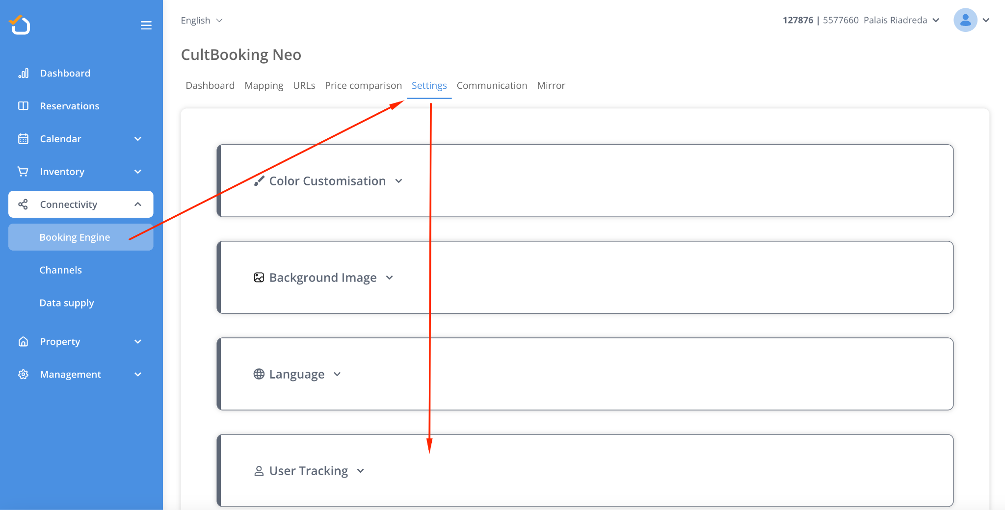 The first step in effective tracking is ensuring that your Booking Engine is integrated with the necessary tracking IDs. Within the Booking Engine interface, navigate to Connectivity > Booking Engine > Settings > User Tracking