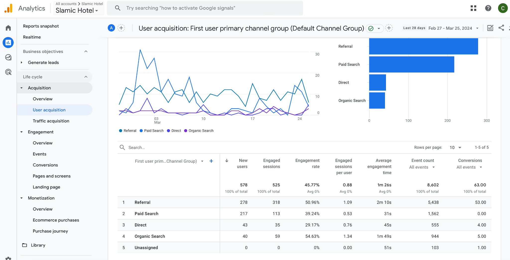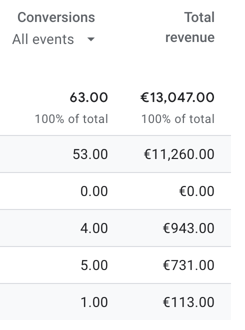 In the below real example, it is clear that Referral is the best working source with 53 conversions achieved. Followed by Organic search with 5 and 4 for direct. Paid search has achieved 0 conversions.