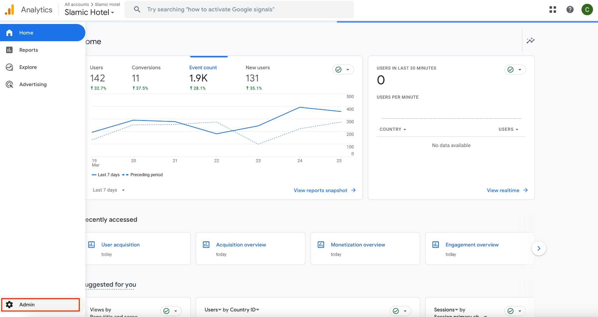 After inserting your own GTM ID, the events will be automatically populated inside the Google Analytics account. There is just some time until the data is being displayed. To see the data, please go to > Admin, to the bottom left side of the page: