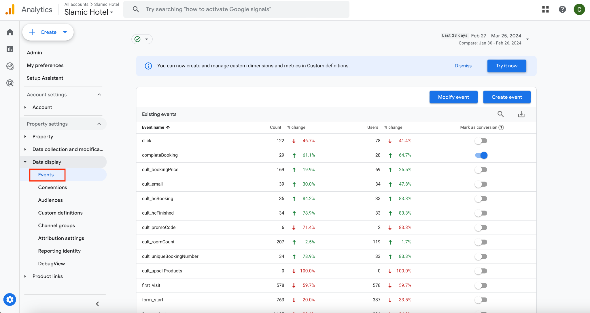 As of 02 Sep 2024, here are some references when comes to events from Google Analytics that has integrated Google Tag Manager for a LIVE hotel: